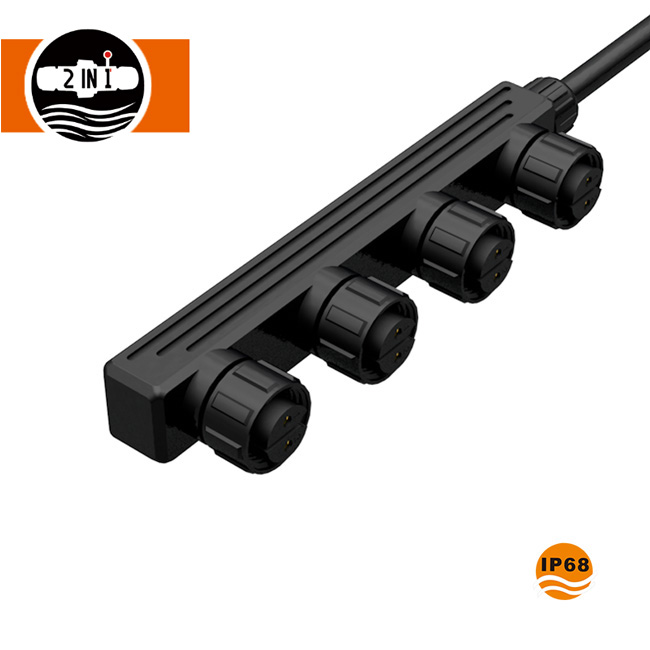 F Shape Multiply Output Konektor Tahan Air M19 3 Pin dapat dicocokkan dengan konektor 3 pin M19, 1 in 2 out, 1 in 3 out, 1 in 4 out, 1 in 5 out tersedia. Konektor M19 F bentuk 3 pin memenuhi peringkat tahan air IP68, Tahan air, tahan lembab, tahan hujan, tahan sinar matahari dan anti korosi, banyak digunakan untuk lampu jalan LED.